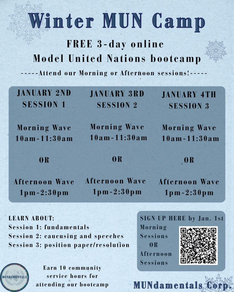 Kick off the new year with our Winter MUN Camp, a three-day virtual bootcamp designed to help students build confidence and develop the core skills used in Model United Nations. Whether you’re brand-new to MUN or looking to sharpen your abilities, this camp offers a supportive space to learn, practice, and connect with other motivated delegates.